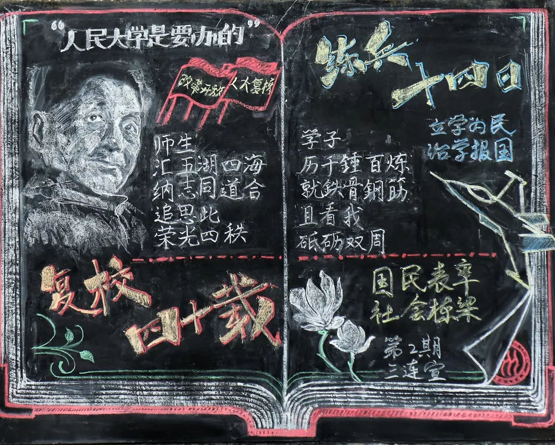 在黑板报绘制比赛中,艺院学子发挥所长,以绘画展青春风采、鼓士气雄风,所绘板报在黑板报评选中获得一致好评。其中,3连以“纪念复效四十年与练兵十四天”为主题的板报荣获“三等奖”,9连以“军营建功新时代”为主题的板报获“最佳美工奖”。
