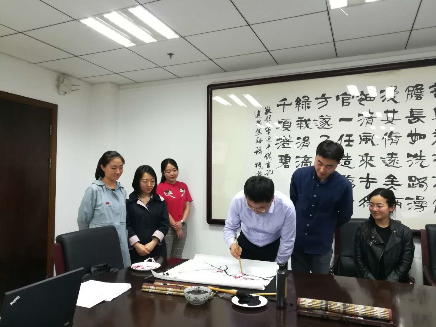 在绘画过程中组织部王铮老师也为其他同学开笔,绘上了一朵纯洁的梅花,象征着自己坚定的信念和初心像天上的恒星,永恒而明亮,随后其他同学也参与进来,纷纷在画面上添砖加瓦,绘上自己的“初心”。
