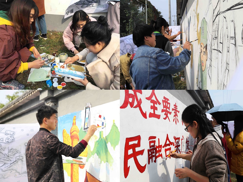 活动当天上午,40名学生党员、入党积极分子及学生会骨干成员经过连续五个多小时的创作,共绘制了6幅“军民融合”主题画。原本光秃的墙壁焕发艺术的光彩,引来村民驻足观望并连连赞赏。