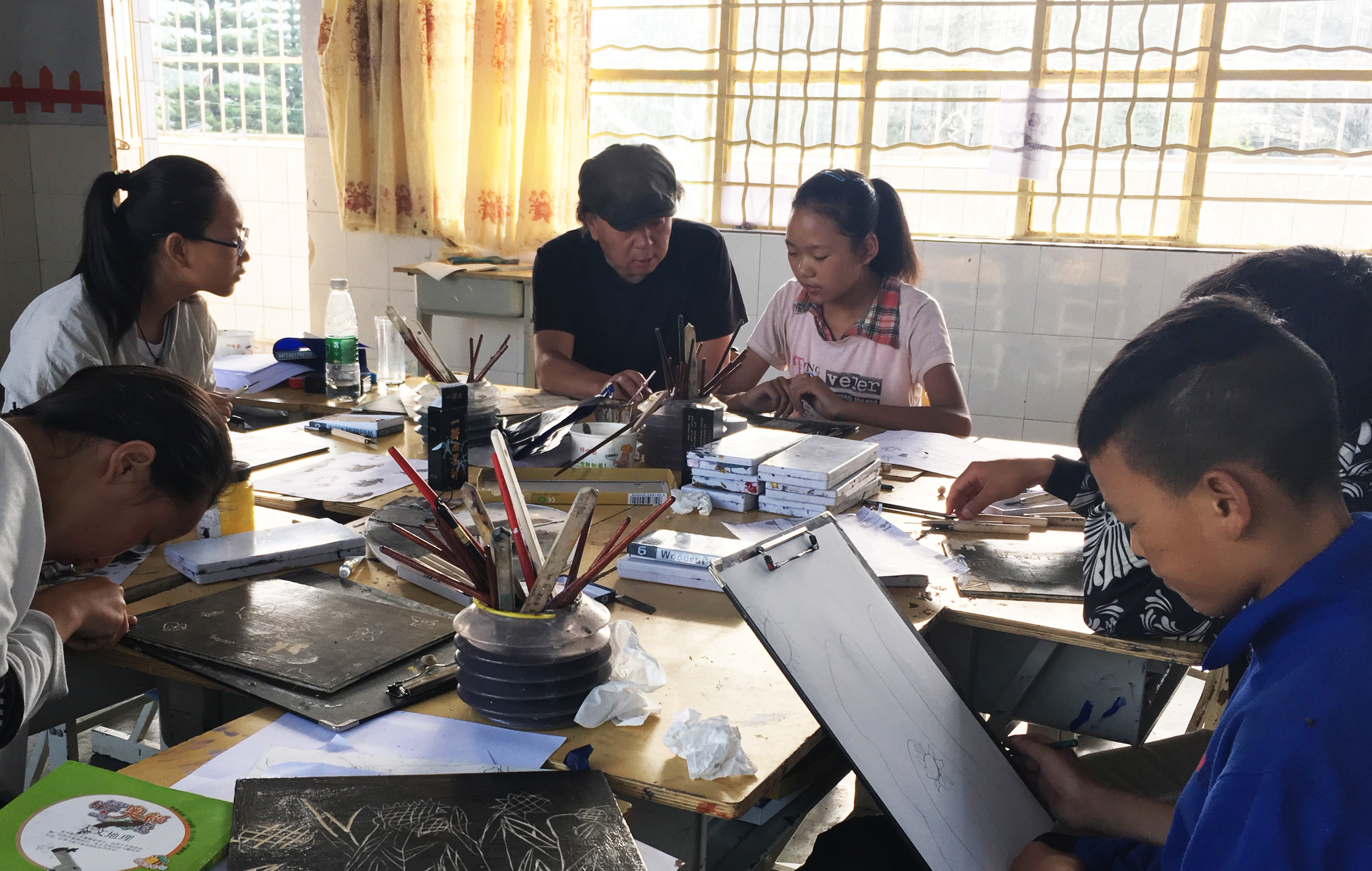 在十四天的教学中,支教同学们以速写课程为主要教学内容,在保证学生造型能力的基础上进行实践创作,并按照学生的兴趣及特点进行分班分科教学,开设了创意色彩班、中国画班、纸上综合材料班、木版木刻班、自画像班、自由创意班等六个美术班次。王家增老师表示:“在短时间内,既要教给学生必要的绘画基础知识和技术,使学生能够向专业的、科学的、规范的绘画方向发展,同时又不能忽视学生的绘画天性,进行一定量的创作训练。”