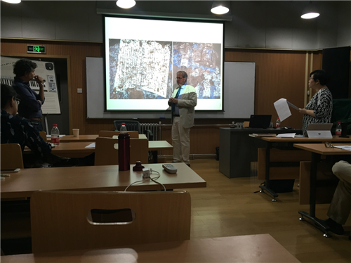 院长丁方教授出席了本次讲座。讲座内容分为两大部分:通往大使厅壁画、体验喀拉汗王朝壁画。讲座以挖掘出土的壁画内容为切入点,介绍了当时现场考察的现状和保存修复这些壁画的信息。此次讲座作为国际学术大师讲堂,我们还有幸的请到了科研处的副处长许勤华教授,许勤华教授介绍了国际大师讲堂和专家授予的情况。