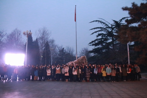 最后,参加升旗仪式的学生与国旗护卫队在实事求是石前合影留念,升旗仪式圆满结束。