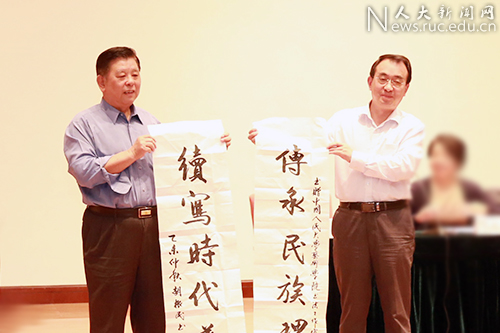 全国政协常委、全国政协科教文卫委员会副主任胡振民在讲话中,从国家文化发展的形势和战略要求高度,对人大书法名家工作室近年来在教学、科研、人才培养、国际交流等方面所取得的成绩,给予了充分肯定,也向在座师生提出了要求和希望。他说,习近平总书记讲话多次提出,建设中国特色社会主义,弘扬中国优秀传统文化是重要组成部分。书法因为是实用文字和艺术的结合,具有广泛的群众基础和社会普及性,对中国特色社会主义精神文明建设有着重要意义。现在国家倡导“中国文化走出去”,展示国家文化软实力;教育部实施中小学“书法进课堂”;全世界四五百所孔子学院开设汉语和中国文化课程,书法艺术事业,面临前所未有的良好机遇。希望大家抓住这个历史机遇,把个人的艺术事业,和国家的发展、时代的需要联系起来。为实现中华民族伟大复兴,实现富强、民主、文明的“中国梦”做出自己的贡献。他同时向人大性视频