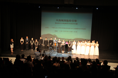 音乐系的音乐家们在系主任王玫副教授带领下在中华世纪坛成功举办讲座《从海顿到施特劳斯——奥地利音乐对欧洲音乐发展史的贡献》公益演讲活动。音乐家们现场带领观众回望了音乐之国奥地利这个欧洲音乐发展的中心,从海顿、莫扎特、舒伯特再到施特劳斯,逐一品味了四位奥地利的音乐大师的风采。