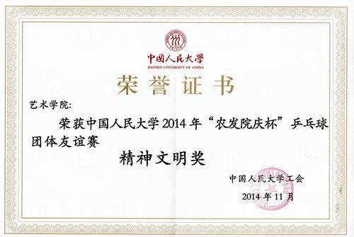2014年“农发院庆杯”教职工乒乓球比赛在世纪馆乒乓球室举行。我院代表队在丁方院长的带领下,同心协力、顽强拼搏,从学校近30支比赛队伍中,脱颖而出跻身前八强,取得我院参加校乒乓球赛历史上最好成绩,同时因在赛场上的精彩表现,我院荣获学校“精神文明奖”。