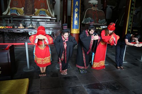 在杭州孔庙留学生在工作人员指导下学习中国古礼
