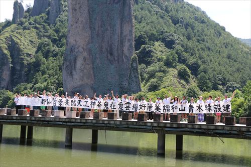 随后,师生一行来到拥有道教三十六洞天之一美誉的缙云仙都采风。采风团参观了缙云河阳古民居、倪翁洞、黄帝祠宇、鼎湖峰等景区,并走访了当地中学,与中学书法爱好者交流。20日下午,在完成参观考察任务后,师生一行在仙都黄帝祠宇前广场集体创作,书写了反映社会主义核心价值观的巨幅长卷,并为仙都风景区创作了以歌颂仙都美丽风光为主题书法作品。