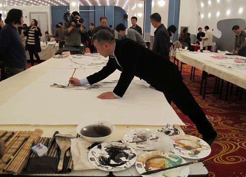 刘泉义等画家积极沟通,认真协商,细心筹划,各自发挥自己在国画创作领域的专长,现场挥毫泼墨,精心创作了一幅丈二作品《赏梅图》,表达了知识分子志向高洁、忧国忧民的高尚爱国情怀,以这种特别的方式为雅安人民祈福。据主办方介绍,黄华三、