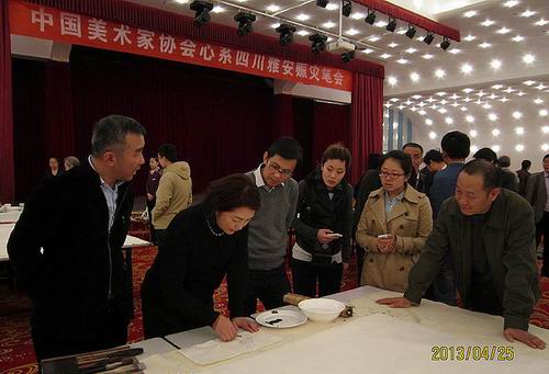 4月25日,中国美术家协会心系四川雅安赈灾笔会在北京举办。中国美术家协会邀请在京的60位著名国画家参与创作,藉此表达广大美术家们对灾区人民的拳拳爱心。
