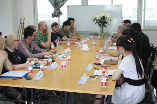 设计专业老师段天然、甘华、郭春宁以及中方技术主要人员北京意向致远公司董事长李喆等参加了此次讨论会议,双方都已完成方案并进行了讨论,确定了作品在技术上的可行性。