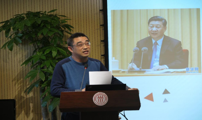 党总支在学院教师发展中心举办全国教育大会专题学习讲座,集体深入学习习近平总书记在全国教育大会上的重要讲话精神。学院党总支书记王建、副书记别敏、全体委员及全院党员师生参与学习。本次讲座由院党总支书记兼副院长王建主持。