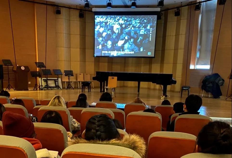 师生在音乐厅集中观看由中央军委政治工作部、国家广电总局和中央广播电视总台联合出品的大型电视纪录片《为了和平》。性视频
