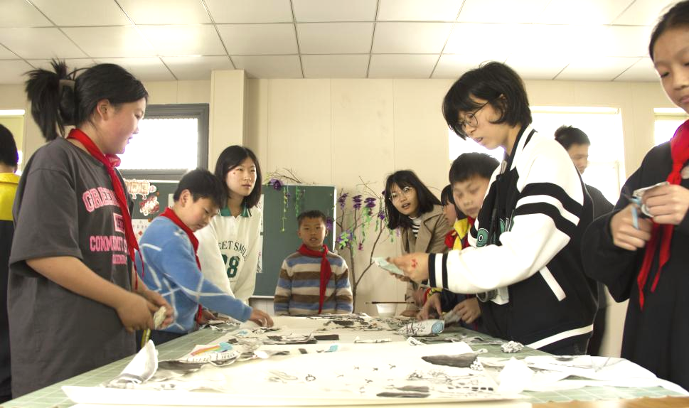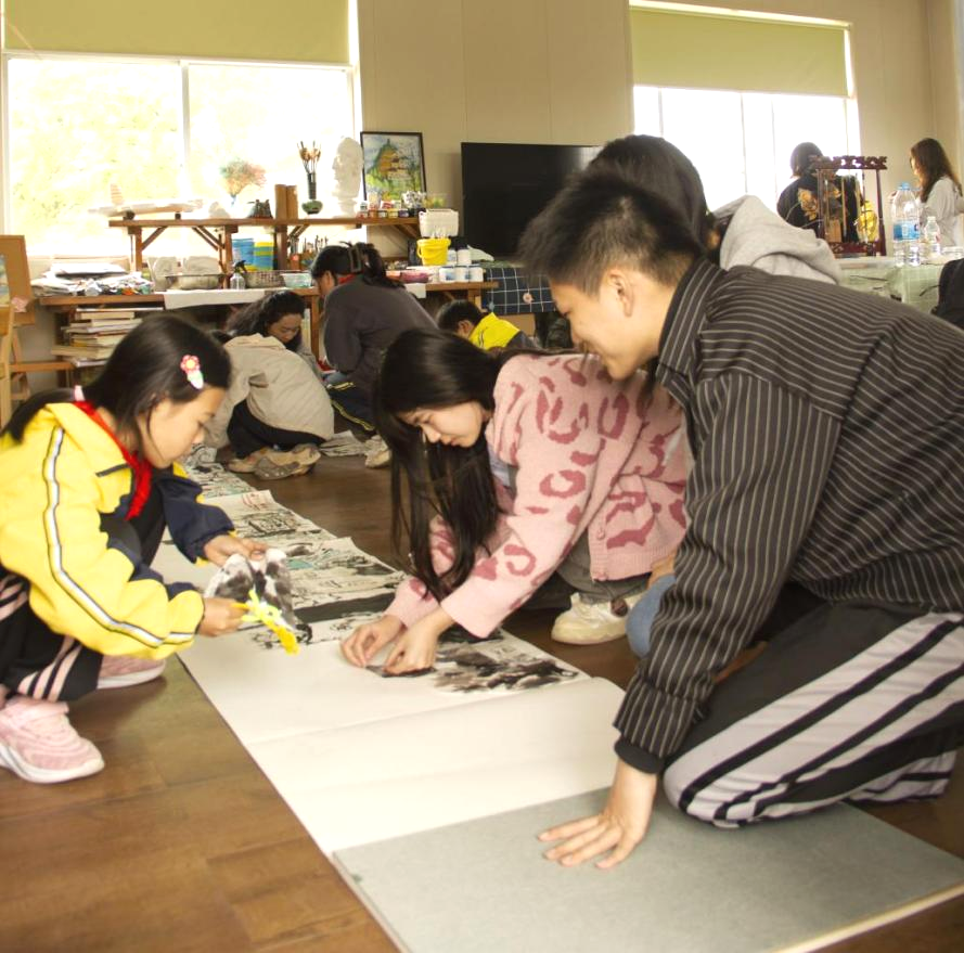 在经过讲解后,同学们充满激情地开始动手制作。在老师和同学们的鼓励和引导下,这些孩子们大胆而自信地在宣纸上自由描绘。随后,他们将完成的作品进行裁剪、整理和拼贴,黏贴在一张近四米长的册页上。通过这样的方式,大家共同完成了一幅独特而富有深意的长卷作品。活动结束后,学院的师生们与孩子们一同合影留念,留下了美好的回忆。