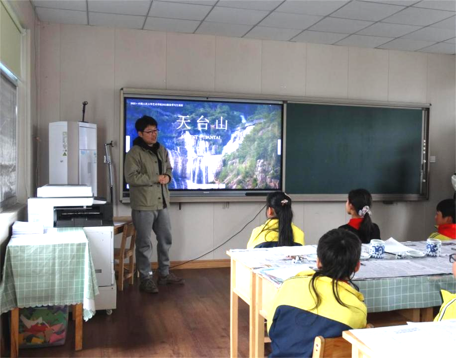 此次课程的主题围绕天台山展开。负责带队写生的高远老师向同学们详细介绍了历代描绘天台山的绘画作品与中国古代绘画装裱的不同形制。通过欣赏这些作品,深化了他们对传统文化的理解。同时,他还简要介绍了水墨媒介的特性与表现方法,希望通过与小学生的互动,让大学生与小学生相互合作,实现教学相长的效果。