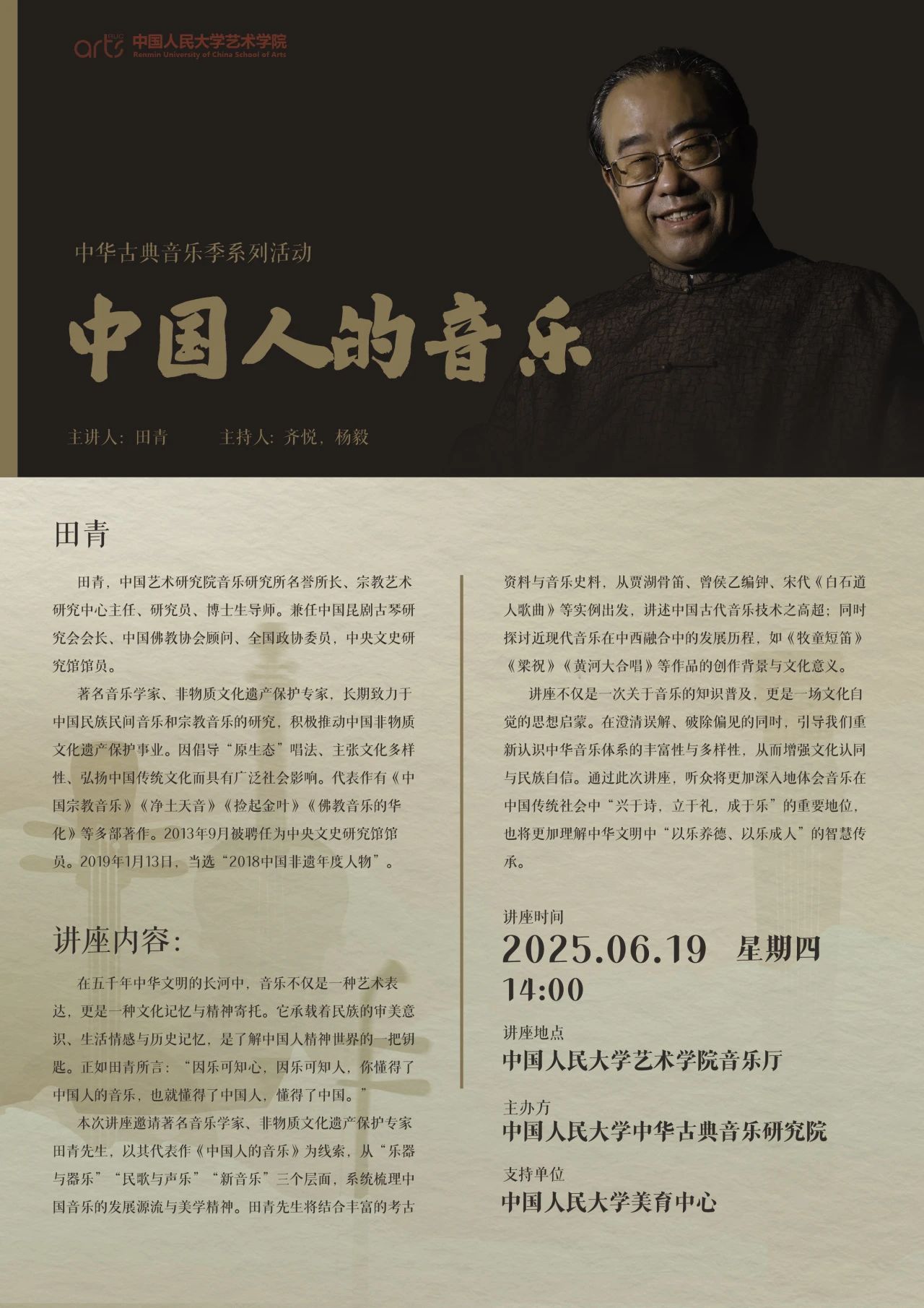 本次讲座邀请著名音乐学家、非物质文化遗产保护专家田青先生,以其代表作《中国人的音乐》为线索,从“乐器与器乐”“民歌与声乐”“新音乐”三个层面,系统梳理中国音乐的发展源流与美学精神。田青先生将结合丰富的考古资料与音乐史料,从贾湖骨笛、曾侯乙编钟、宋代《白石道人歌曲》等实例出发,讲述中国古代音乐技术之高超;同时探讨近现代音乐在中西融合中的发展历程,如《牧童短笛》《梁祝》《黄河大合唱》等作品的创作背景与文化意义。