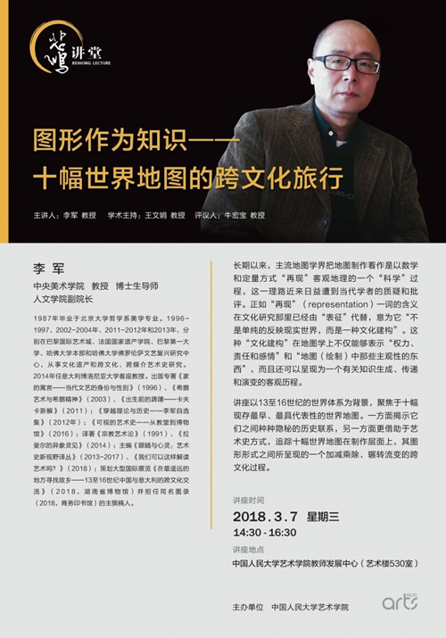 主讲人简介:李军,中央美术学院教授,人文学院副院长,博士生导师。1987年毕业于北京大学哲学系美学专业。1996-1997、2002-2004年、2011-2012年和2013年,分别在巴黎国际艺术城、法国国家遗产学院、巴黎第一大学、哈佛大学本部和哈佛大学佛罗伦萨文艺复兴研究中心,从事文化遗产和跨文化、跨媒介艺术史研究。2014年任意大利博洛尼亚大学客座教授。出版专著《家的寓言——当代文艺的身份与性别》(1996)、《希腊艺术与希腊精神》(2003)、《出生前的踌躇——卡夫卡新解》(2011);《穿越理论与历史——李军自选集》(2012年);《可视的艺术史——从教堂到博物馆》(2016);译著《宗教艺术论》(1991)、《拉斐尔的异象灵见》(2014);主编《眼睛与心灵:艺术史新视野译丛》(2013-2017)、《我们可以这样解读艺术吗?》(2018);策划大型国际展览《在最遥远的地方寻找故乡——13至16世纪中国与意大利的跨文化交流》(2018,湖南省博物馆)并担任同名图录(2018,商务印书馆)的主撰稿人。