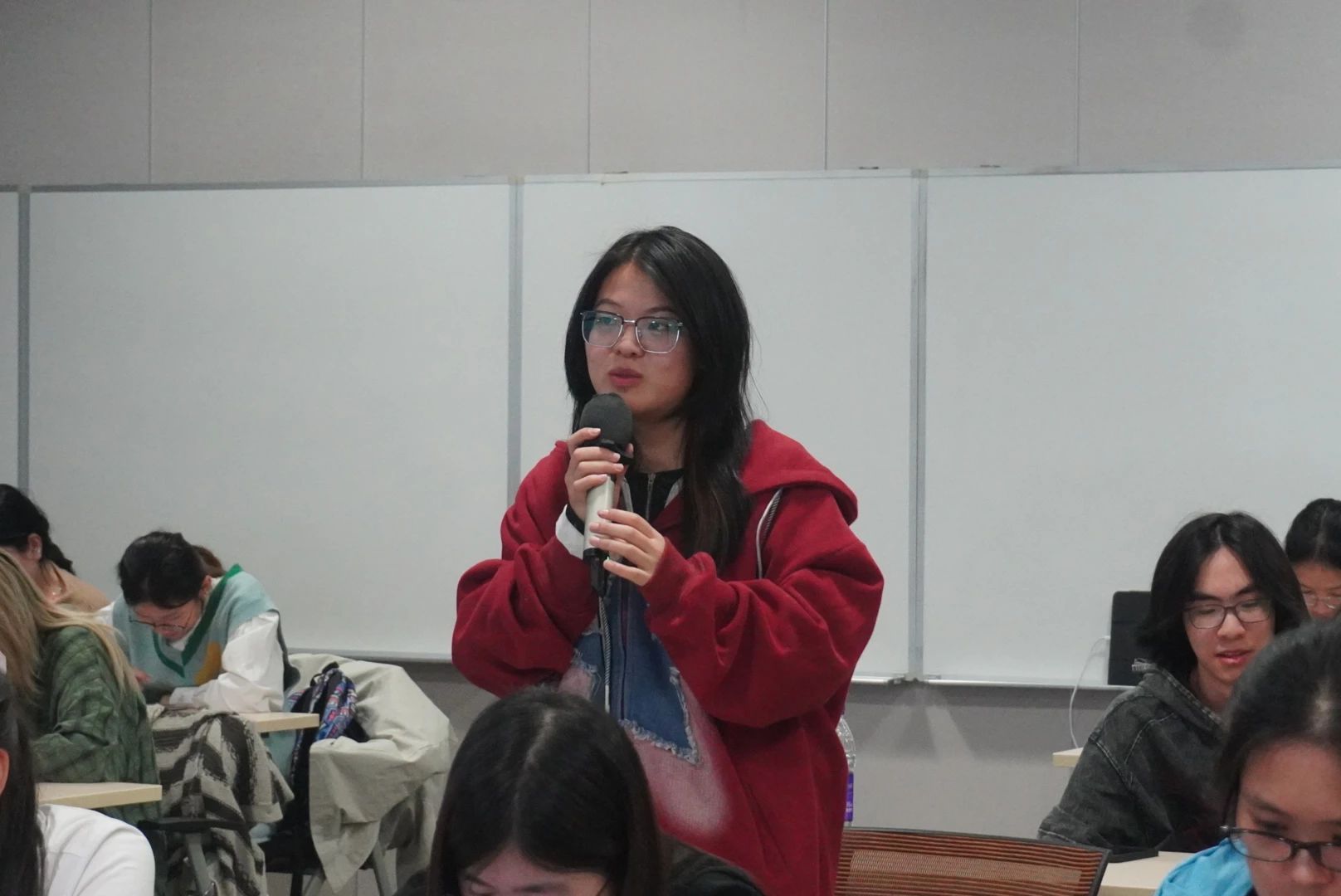 在分享环节,王汝灏以“边疆守护者”为主题,深情讲述了新疆义务守边人、红军遗孀等群体的感人事迹。他通过一个个鲜活的案例、详实的数据,让在场师生对“大安全”格局有了更立体的认知。当投影幕布上呈现出一位八旬老兵在边疆巡线的身影时,他动容地说:“岁月静好,只因有人负重前行。当代青年应以先锋为镜,到祖国最需要的地方建功立业”。同学们被“一家三代守边关”的忠诚坚守深深触动。