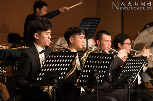 音乐比赛获奖学生代表先后联合演奏了莫扎特《降E大调交响协奏曲第三乐章》、贝多芬《第五钢琴协奏曲第一乐章》、格里格《a小调钢琴协奏曲第一乐章》等经典曲目,激越昂扬的乐章为现场观众带来了一场视听盛宴。在男高音独唱《延安颂》的豪迈歌声中,整场音乐会掀起高潮,大气磅礴的旋律生动再现了延安精神鼓舞人心的战斗气息。《默默静听》二重唱、歌剧《卡门》选段、《爱情像一只自由小鸟》、《蓝色多瑙河》等曲目以精湛的演奏技艺和动感的美妙音符,向全校师生传递了新年的美好祝福。最后,和着全场观众整齐划一的鼓掌节拍,在返场曲目《拉德斯基进行曲》动感欢快的乐声中,音乐会落下帷幕。