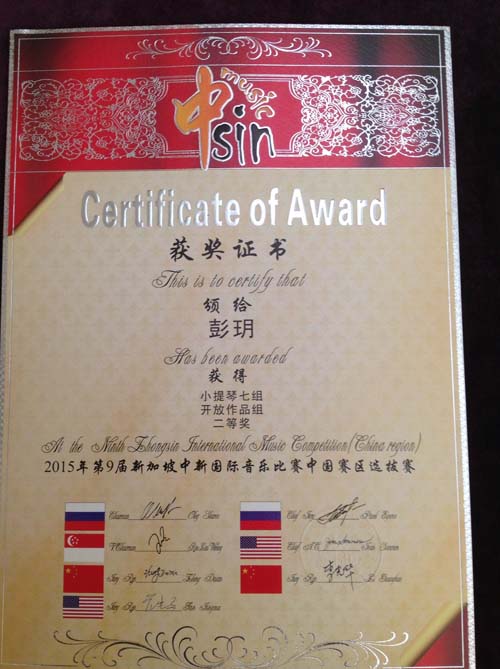 “第九届新加坡中新国际音乐比赛中国赛区选拔赛”日前在北京举行。我院2014级音乐表演专业本科生彭玥获得开放作品组二等奖的佳绩,并将于2015年2月份前往新加坡参加决赛。彭玥的主要指导老师为我院音乐系副教授程亚威。