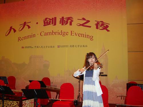 出版社和剑桥大学出版社联合举办的“人大——剑桥之夜”活动于2011年8月29号晚在香格里拉酒店举行。我院副院长兼音乐系主任赵方教授和音乐系2010级杨帆同学作为嘉宾应邀参加了该活动并表演了精彩的节目,受到来自国内外出版界和媒体的热烈欢迎。