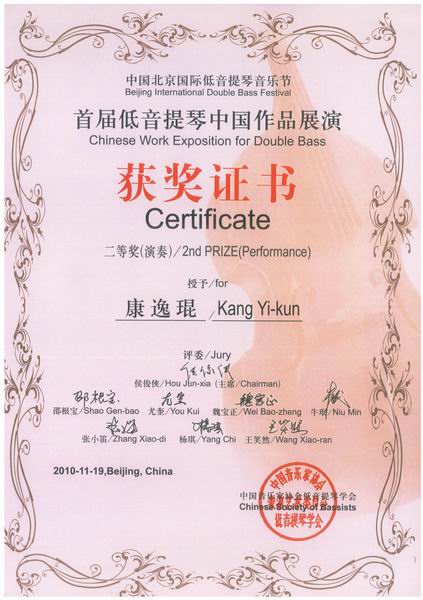 “中国北京国际低音提琴音乐节首届低音提琴中国作品比赛”二等奖