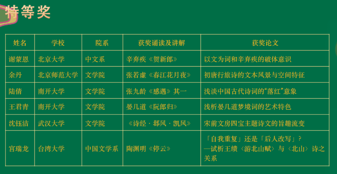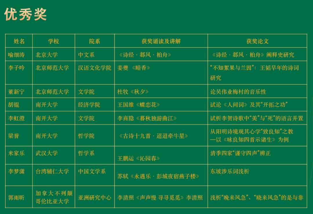 出席叶嘉莹民生奖学金组的评选委员有:南开大学中华古典文化研究所副所长张静,北京大学古代文学教研室主任常森、北京师范大学古代文学研究所所长张德建,武汉大学文学院院长涂险峰。