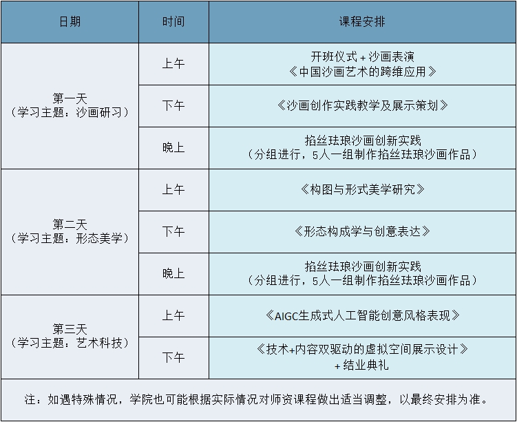 紧扣沙画、文旅等从业和创意策划跨界人才的现实需求,设置“沙画研习+形态美学+艺术科技”三大模块,通过系统化全链条的课程体系,锻造学员“理论筑基、创意策划、实务操作”的全链能力提升。